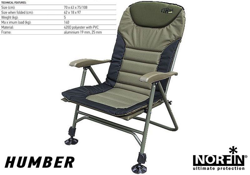 Η συγκεκριμένη καρέκλα της Norfin έχει ονομασία “HUMBER”, είναι κατασκευασμένη από αλουμίνιο, με αποτέλεσμα να είναι αρκετά ελαφριά σε σχέση πάντα με το μέγεθος της. Μπορεί να συναρμολογηθεί εύκολα στον χώρο που έχουμε επιλέξει να ψαρέψουμε. Διαθέτει δεξιά κι αριστερά στηρίγματα για τα χέρια μας. Διαθέτει στο πάνω μέρος της, στο σημείο που ακουμπάει το καφάλι μας, μαλακό και άνετο μαξιλάρι.