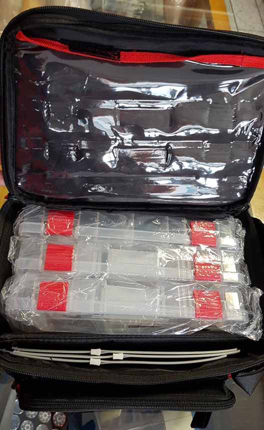 Εσωτερικά 3 πλαστικές θήκες με χωρίσματα καθώς και διαχωριστικό με χριτς/χρατς στο οποίο μπορουμε να τοποθετήσουμε καλαμαριέρες με τα κουτάκια τους ή στις ήδη 3 υπάρχοντες ναυλον θήκες σιλικόνες και οτιδήποτε άλλο. Στο καπάκι διαθέτει εσωτερική τσέπη για διάφορα αντικείμενα.