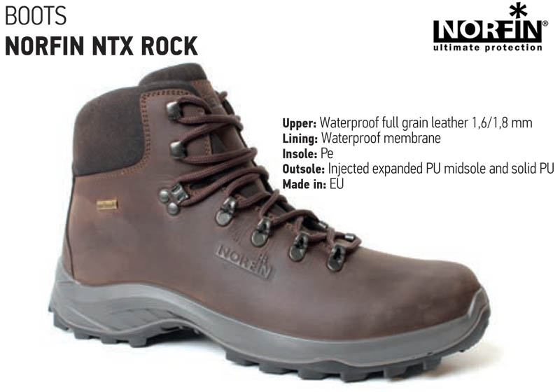Διαπνέον μποτάκια εξαιρετικής ποιότητα από την NORFIN που ακούνε στο όνομα NTX ROCK. Ιδανική επιλογή για ψάρεμα σε βράχια ενώ ενδείκνυται και για ορειβασία. Διαθέτουν ποιοτικούς μαλακούς και πάνω από όλα ορθοπεδικούς πάτους ώστε να νιώθουμε άνετα. Είναι διαπνέον που σημαίνει πως αναζωογονείται ο αέρας με αποτέλεσμα να μην ιδρώνουν τα πόδια μας. Είναι κατασκευασμένα από 100% δέρμα του οποίου η προσαρμογή του στη σόλα έχει γίνει με τέτοιο τρόπο ώστε να μην έχουν χρησιμοποιηθεί πολλές ραφές. Όσο λιγότερες ραφές σε τέτοιου τύπου μποτάκια τόσο το καλύτερο, ειδικά ως προς την αδιαβροχοποίηση τους αλλά και την αντοχή τους στο χρόνο. Τα μποτάκια NTX ROCK επομένως είναι ανθεκτικά και πλήρως αδιάβροχα για… πολλά χρόνια σκληρής χρήσης!!! Δένουν αρκετά ψηλά ώστε να κρατάνε τον αστράγαλο καλά ασφαλισμένο σε κάποιο πιθανό στραβοπάτημά μας την στιγμή που περπατάμε σε βράχια. Τέλος διαθέτουν τραχτερωτή σόλα για ασφαλή “πατήματα” σε δύσκολα εδάφη…